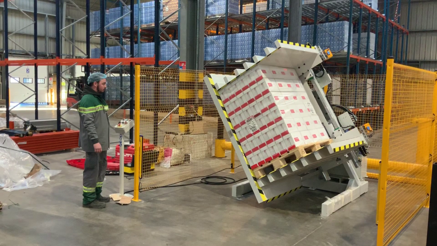 开始操作时,使用叉车或托盘千斤顶将货物整体装入机器。待货物就位后,操作员进行固定并通过控制面板实施180°安全旋转(支持手动/自动模式选择)。货物倒置阶段完成旧托盘卸除与新托盘定位,随后机器将货物复位至初始状态,确保新托盘就位后即可进行货物提取。