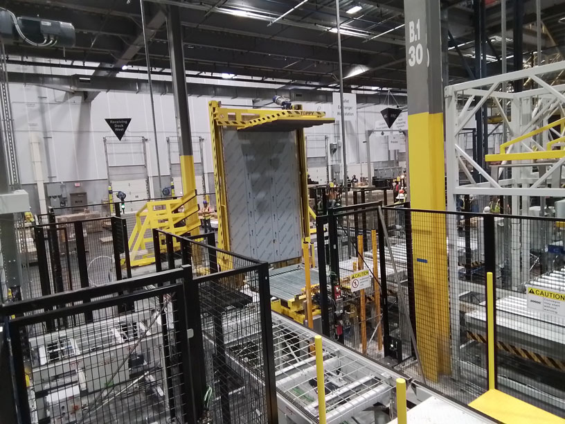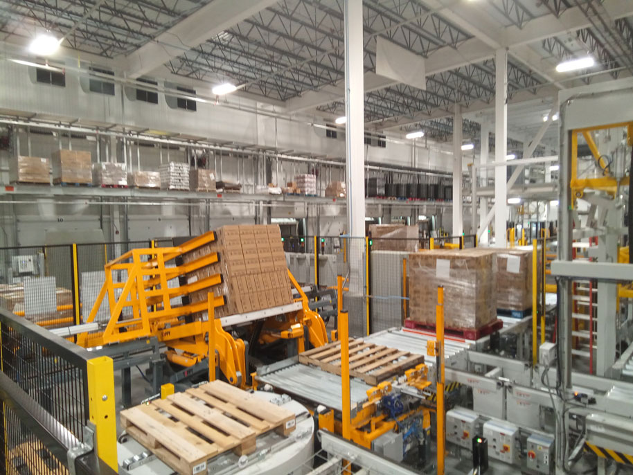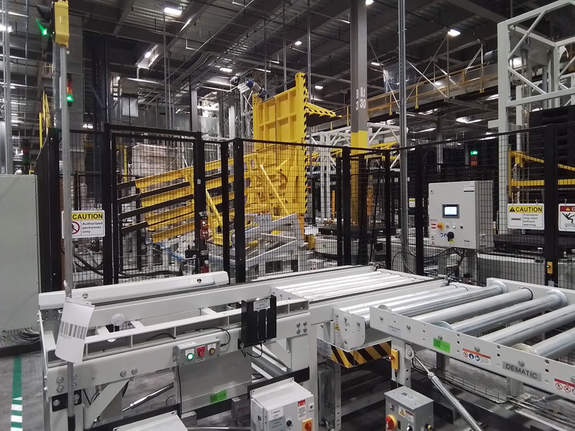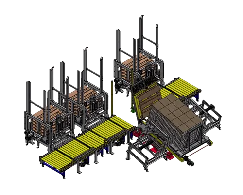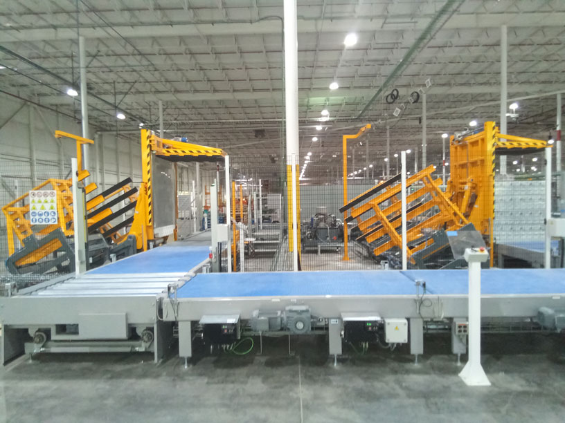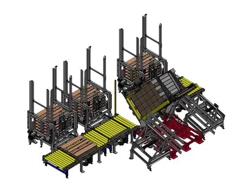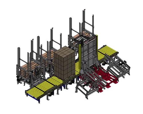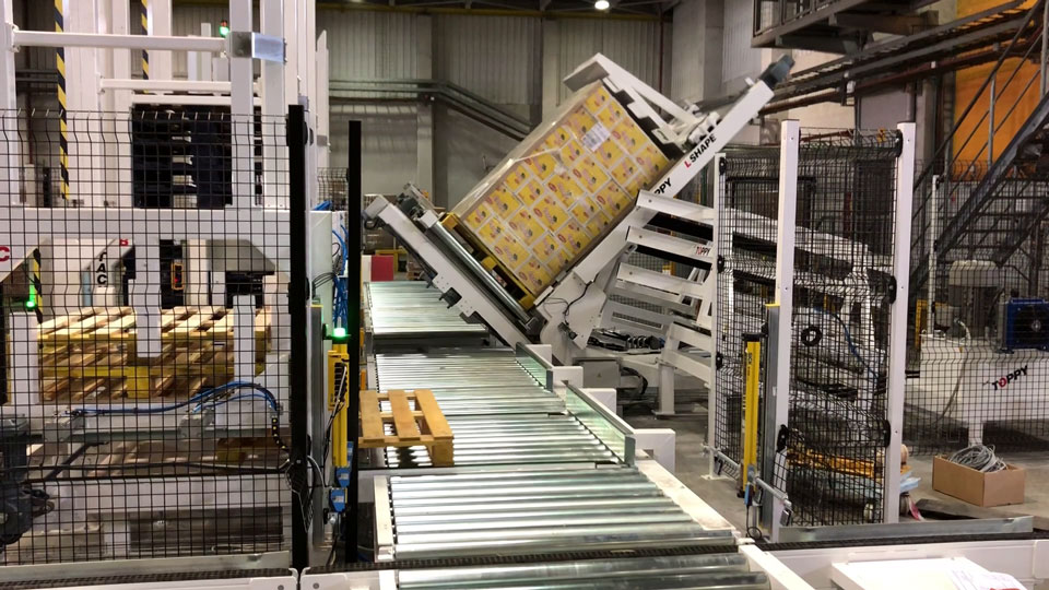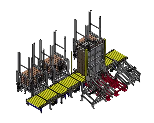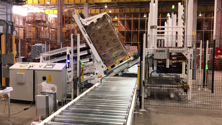 该自动托盘转换器支持将内部产品支撑板上的货物转换为任何其他类型托盘。