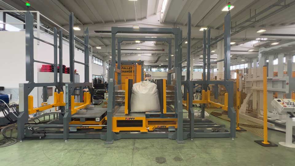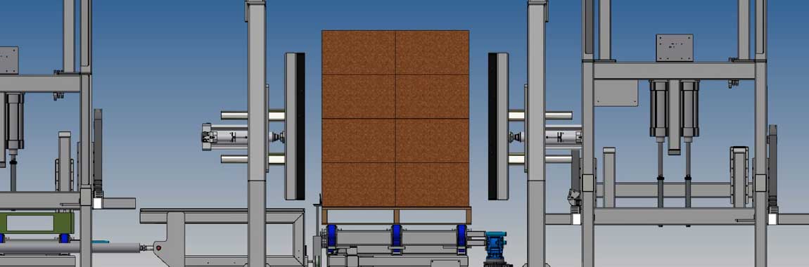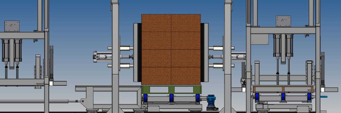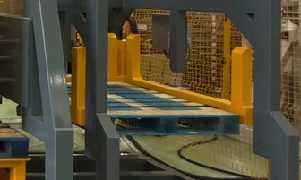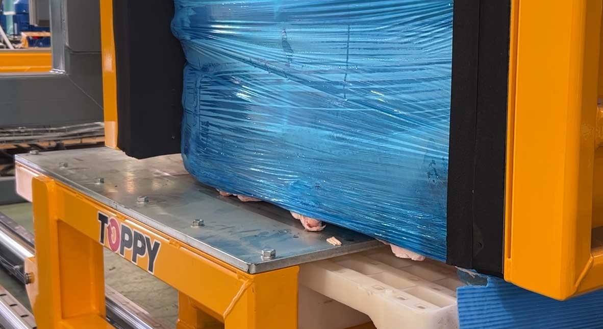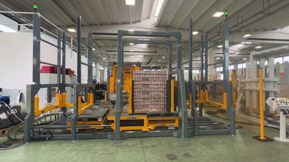 操作员将货物放入机器后,通过机器旁的按钮面板启动循环。随后侧压板启动以固定产品,此时目标托盘滑动至货物下方,原托盘则被移入料仓。